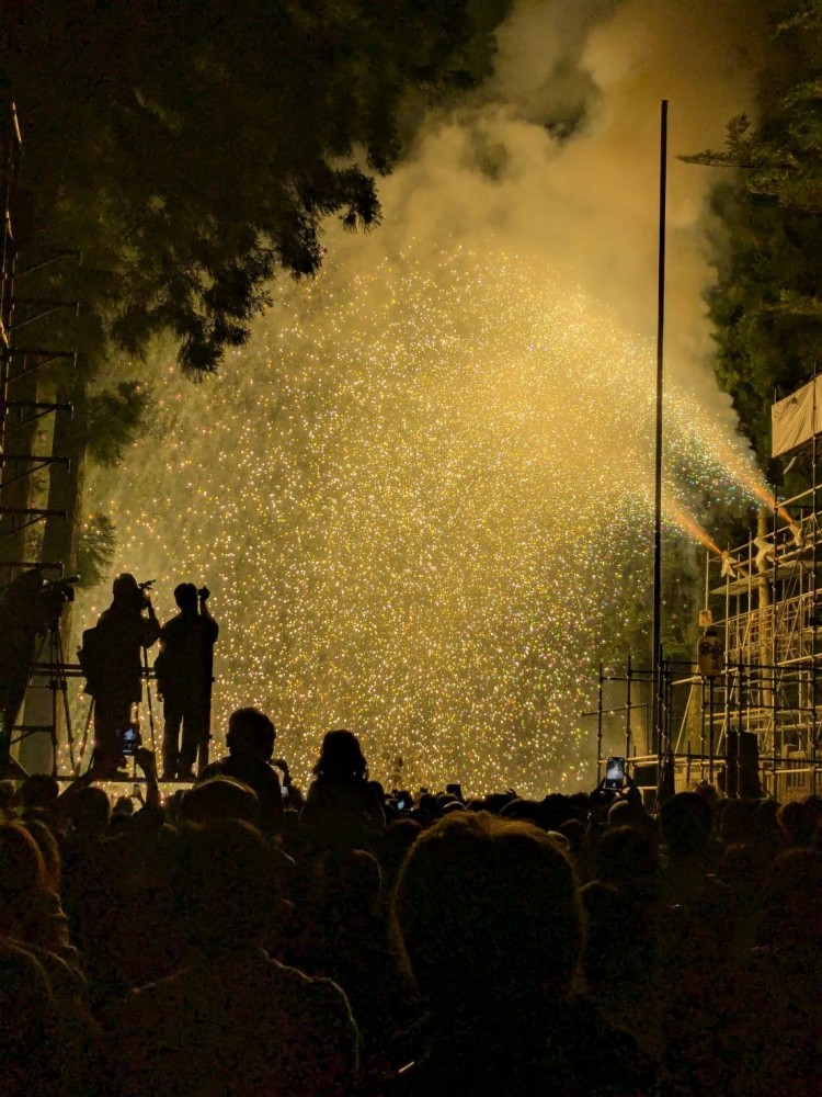笛や太鼓の音、三国煙火の火の粉が振り注ぐ様子をお楽しみください