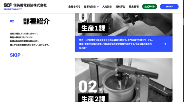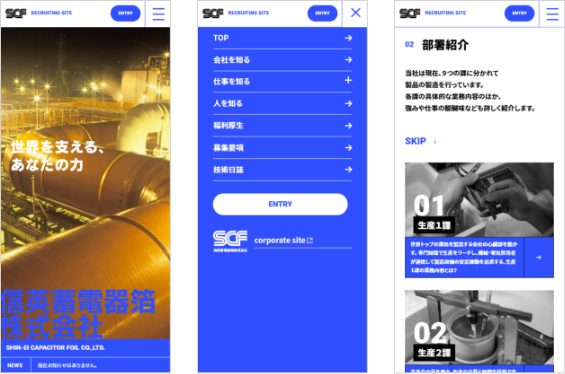 | 説明 | 信英蓄電器箔株式会社様の採用サイトを制作しました。 理系の男性社員が多く在籍する職場という特徴を踏まえ、サイト全体は端正で整然としたレイアウトを採用。鮮やかなブルーを基調としたデザインにより、誠実さと爽やかさを感じられる印象を目指しました。 また、若年層にも興味を持ってもらえるよう、「タイプ別で向いている部署がわかる」カジュアルなコンテンツも盛り込み、親しみやすさと情報の分かりやすさを両立させています。 |